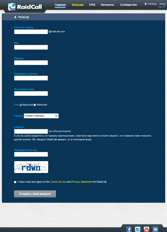 Перейдите на страницу регистрации и заполните все обязательные поля, введите проверочный код (капча), поставьте галочку перед «I have read and agree to the Terms of Use and Privacy Statement for RaidCall» и нажмите кнопку «Создать мой аккаунт».