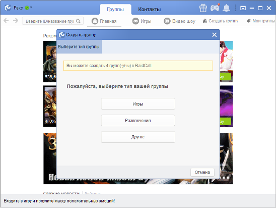 Также, Вы можете создать свою группу (если это необходимо) в RaidCall, нажав закладку «Создать группу».