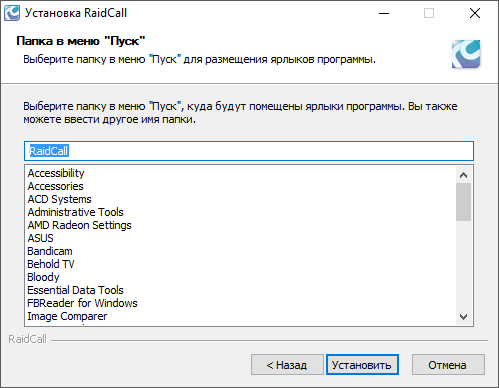 6. Выбираем папку в меню «Пуск», куда будут помещены ярлыки RaidCall. Нажимаем «Установить».