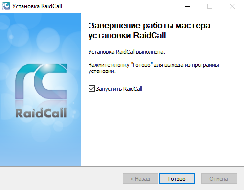 8. Установка RaidCall завершена. Галочку «Запустить RaidCall» не снимаем, нажимаем «Готово».